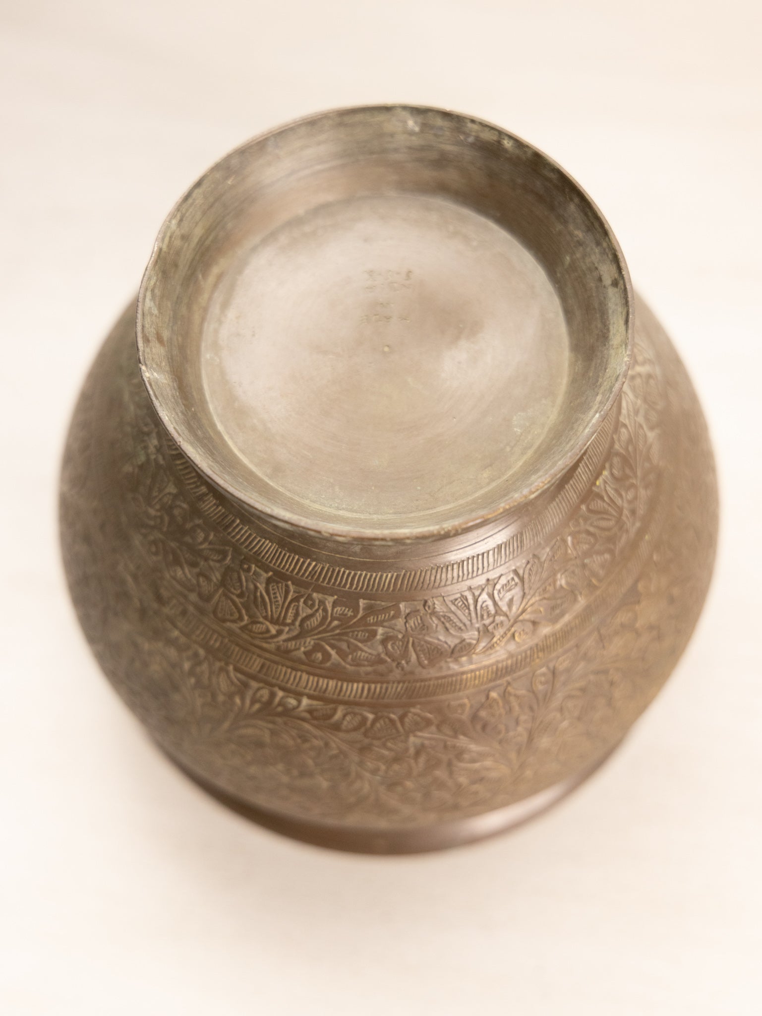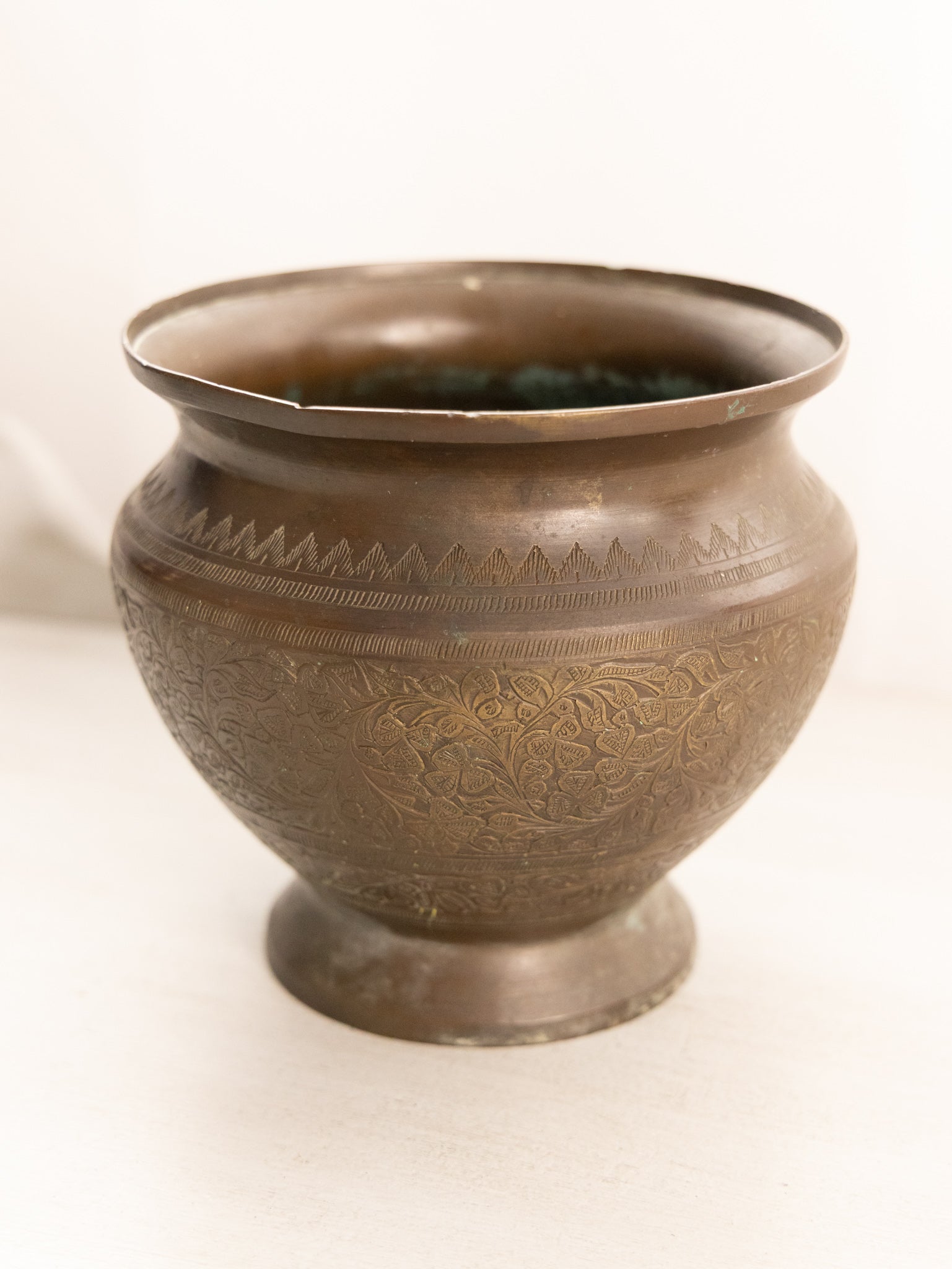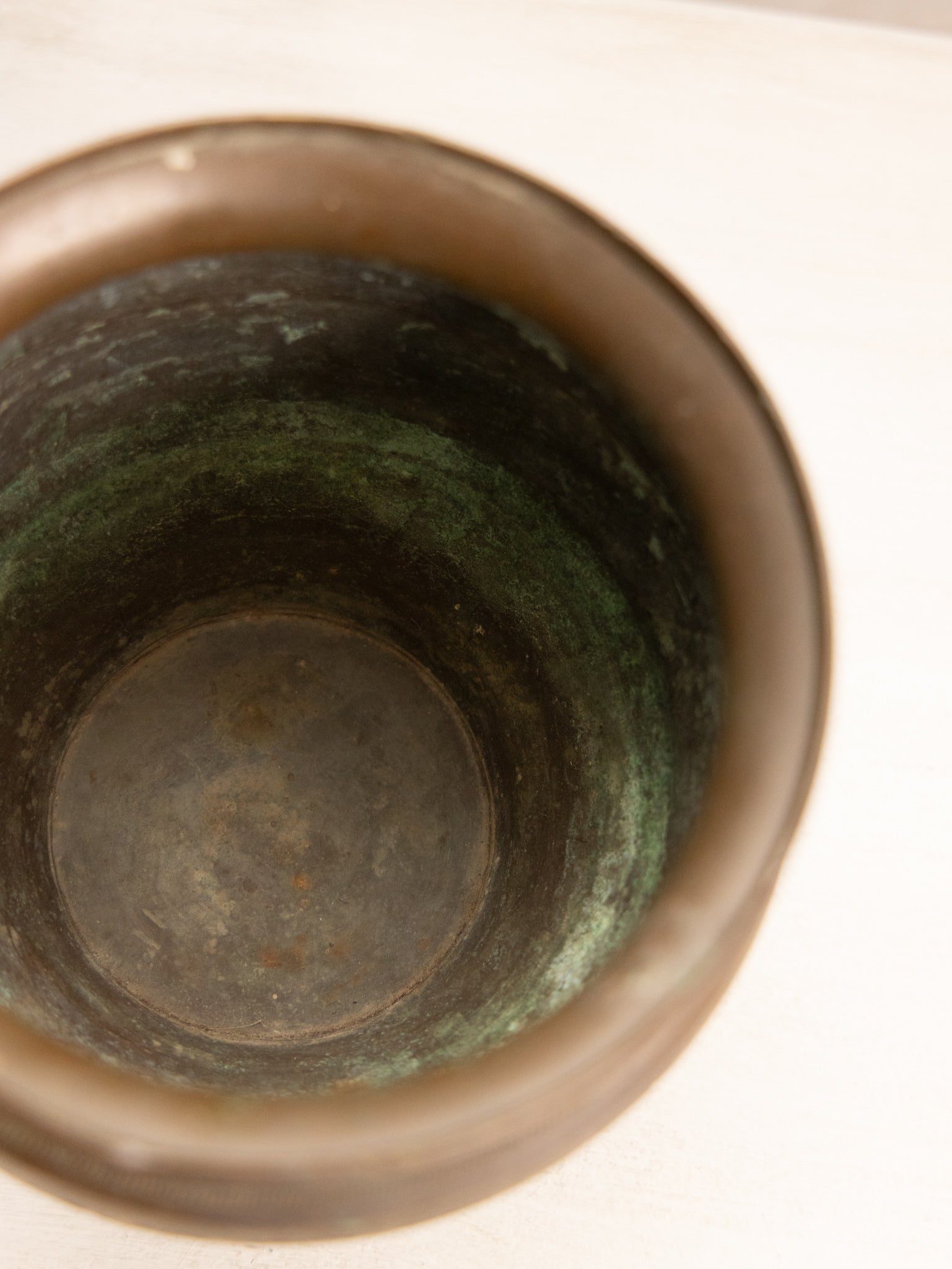 - Great used condition: item(s) may have light scratches, small marks, tarnishing/patina (for metal items), minor unevenness/wobbles, minor roughness/flea bites, and mild wear typical of age and normal use. Small dent on one side, possibly from production. Small hole near the upper rim. Fair amount of patina inside.