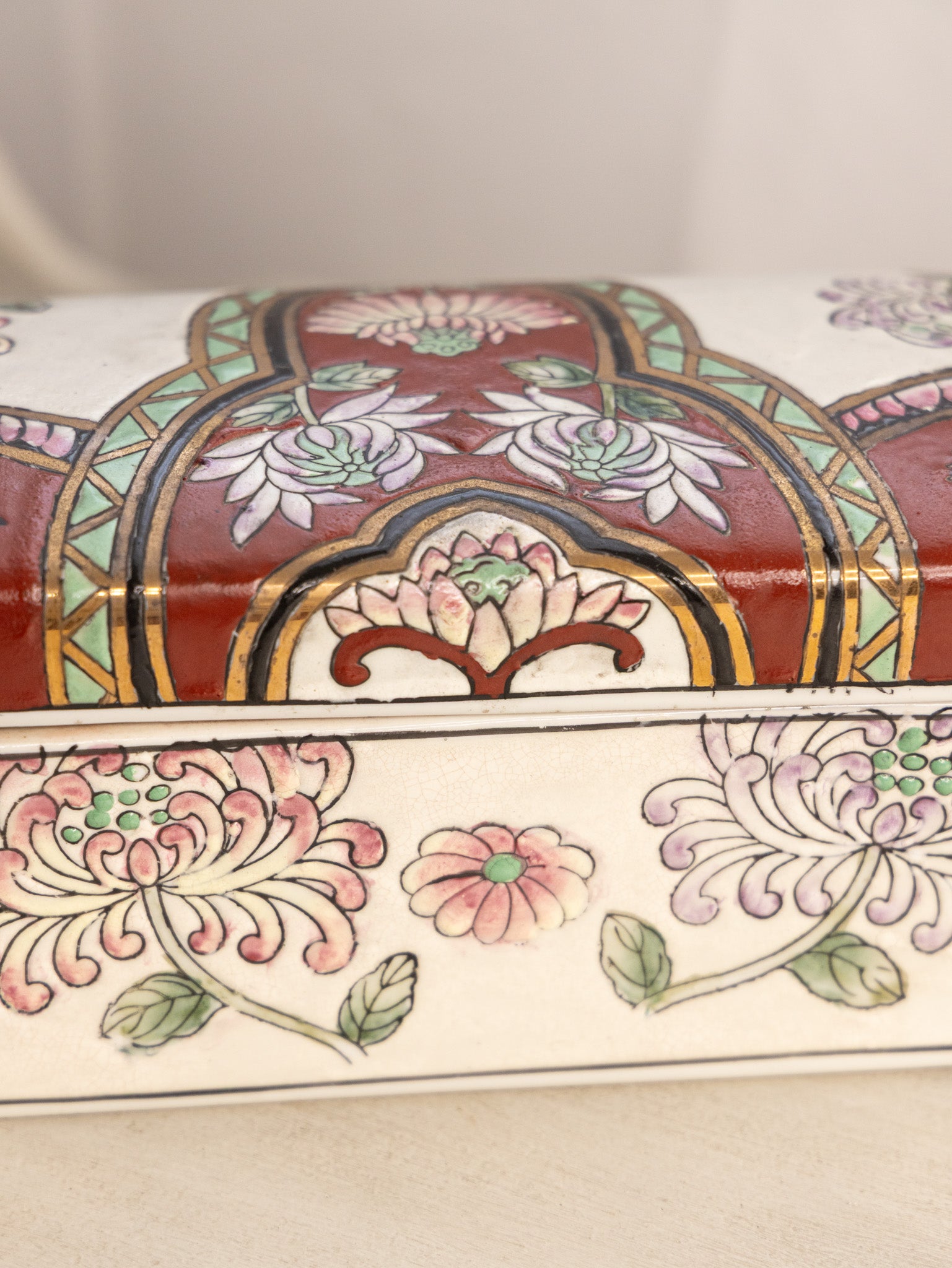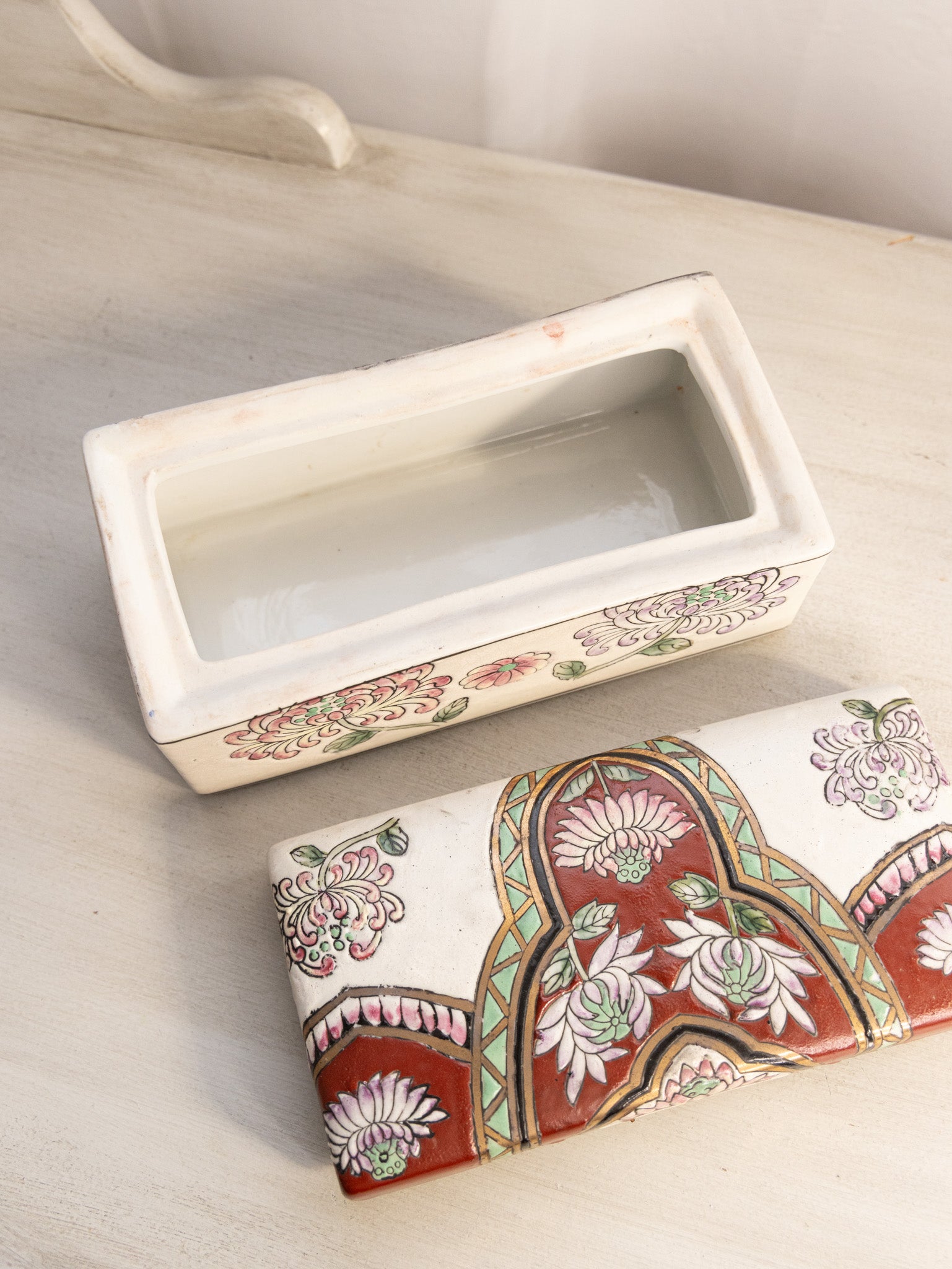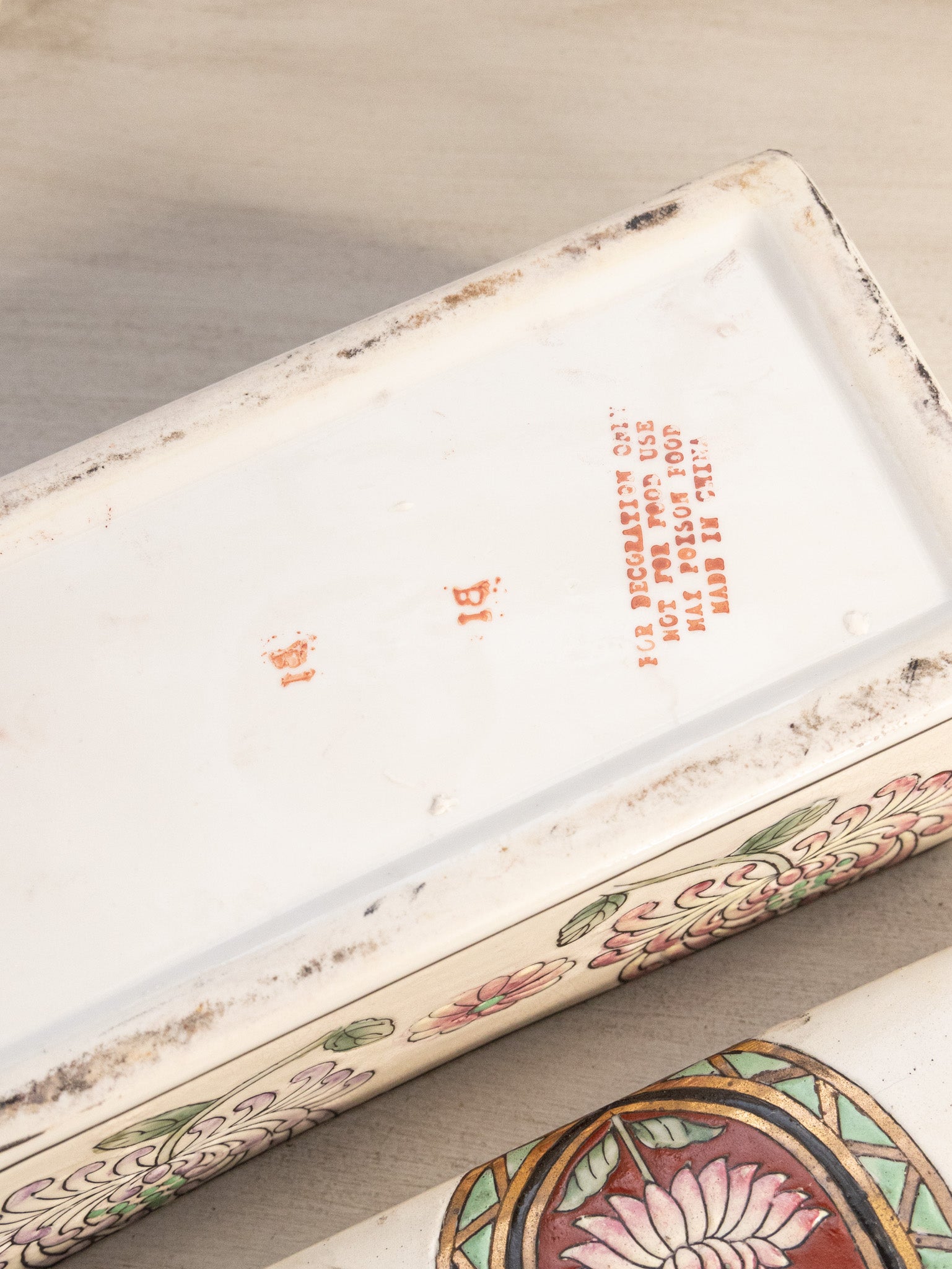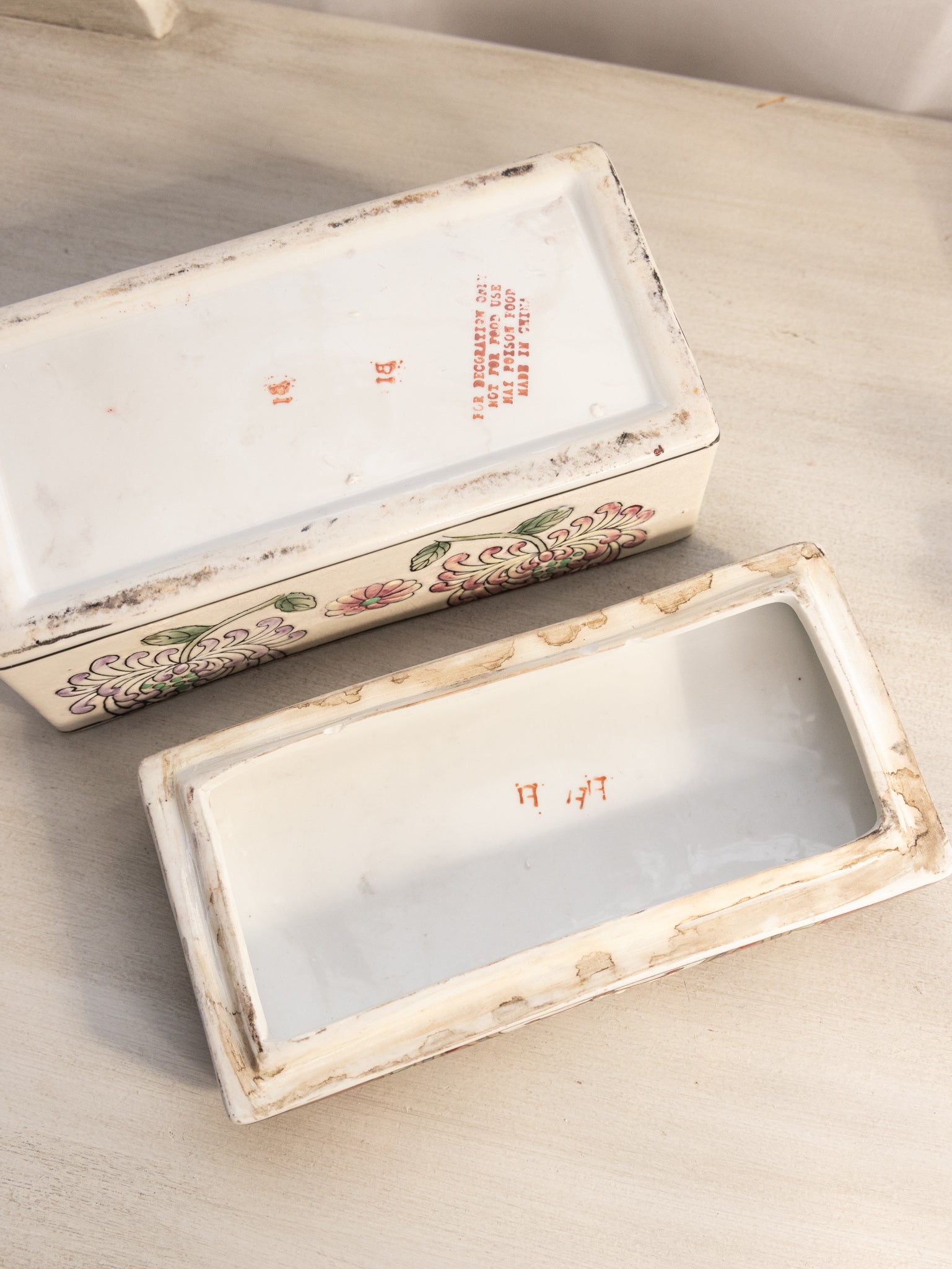 - Great used condition: item(s) may have light scratches, small marks, tarnishing/patina (for metal items), minor unevenness/wobbles, minor roughness/flea bites, and mild wear typical of age and normal use. 3 small chips along lower inner edge of top piece. Has crazing. May not be vintage.