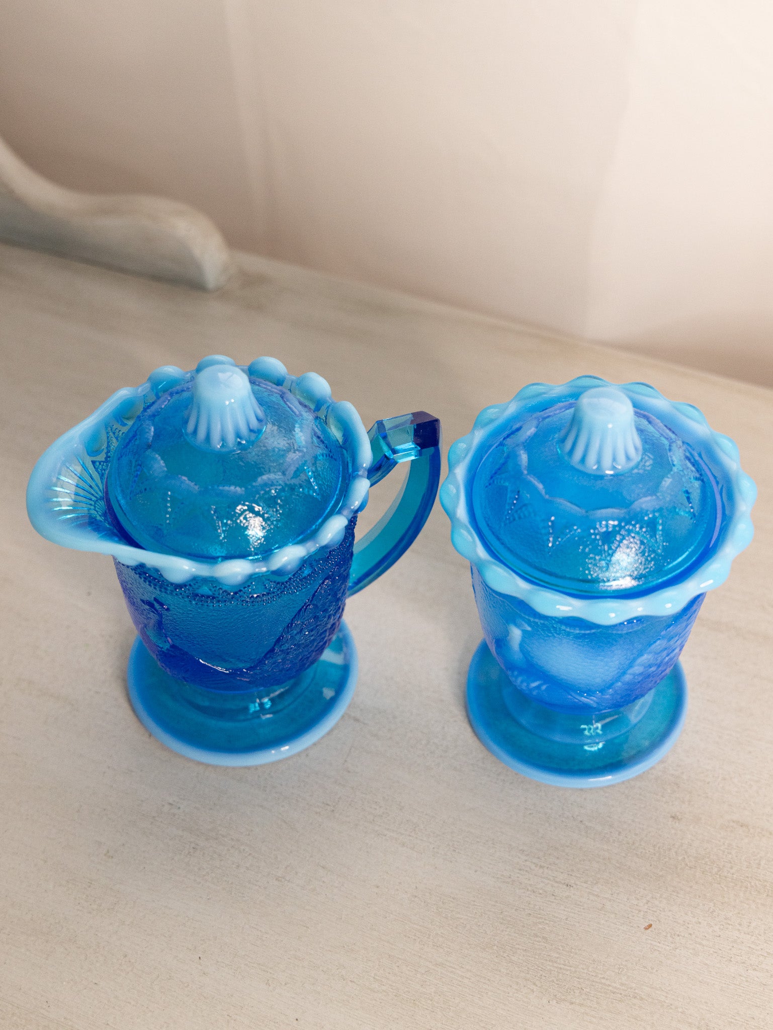 - Approximate Measurements: Creamer: 5" length, 3.5" width, 5.25" height. Sugar: 3.75" diameter, 5.5" height