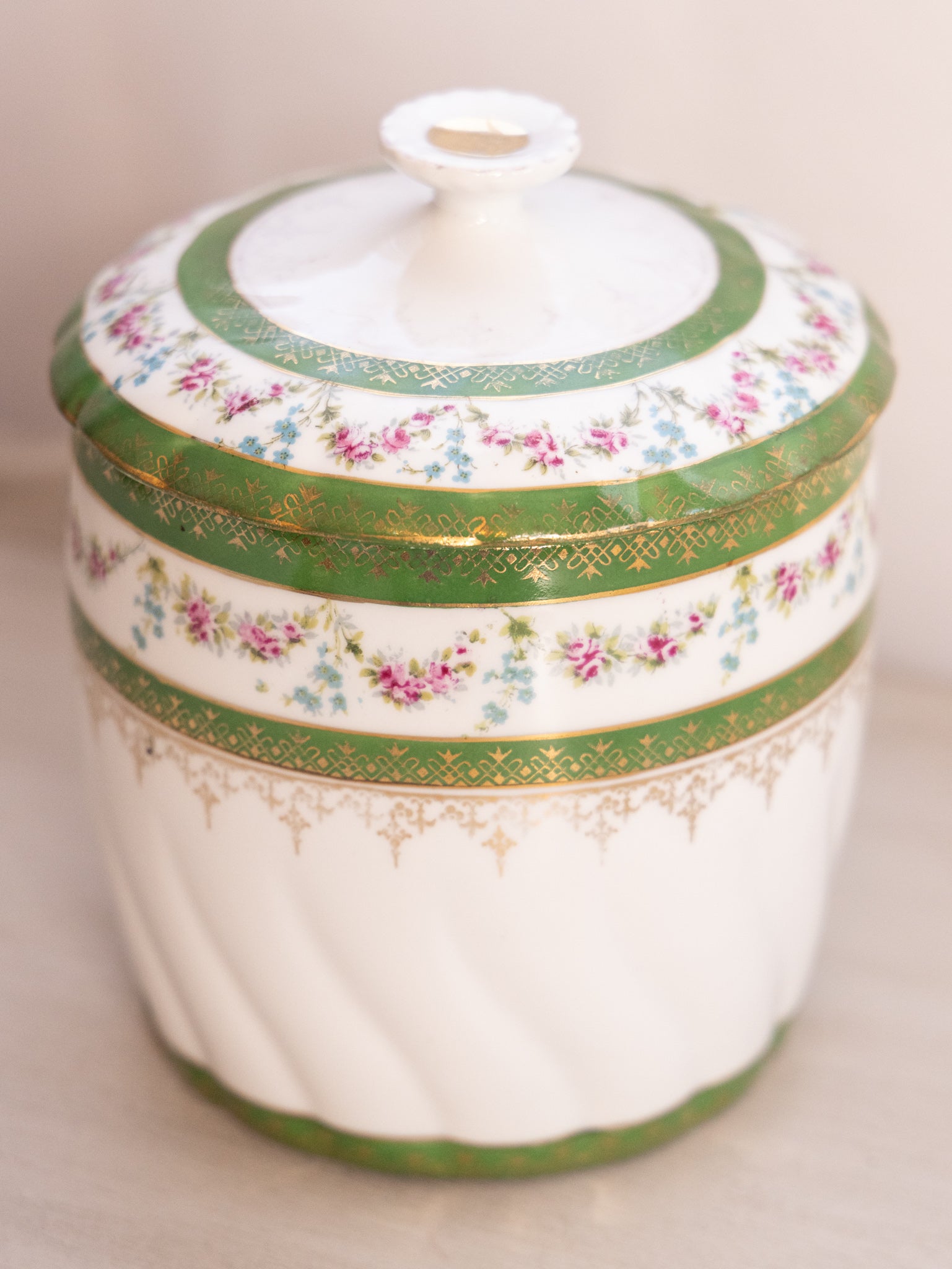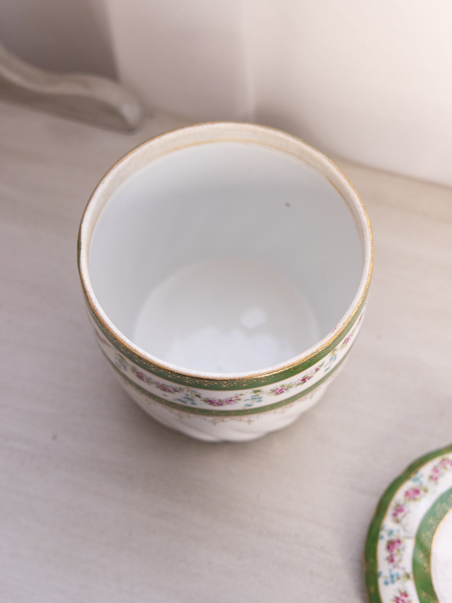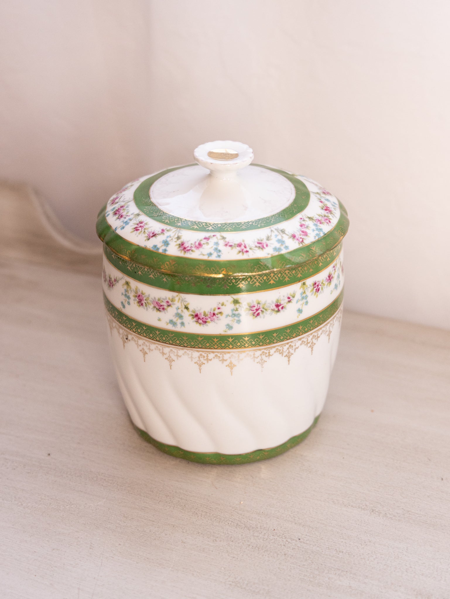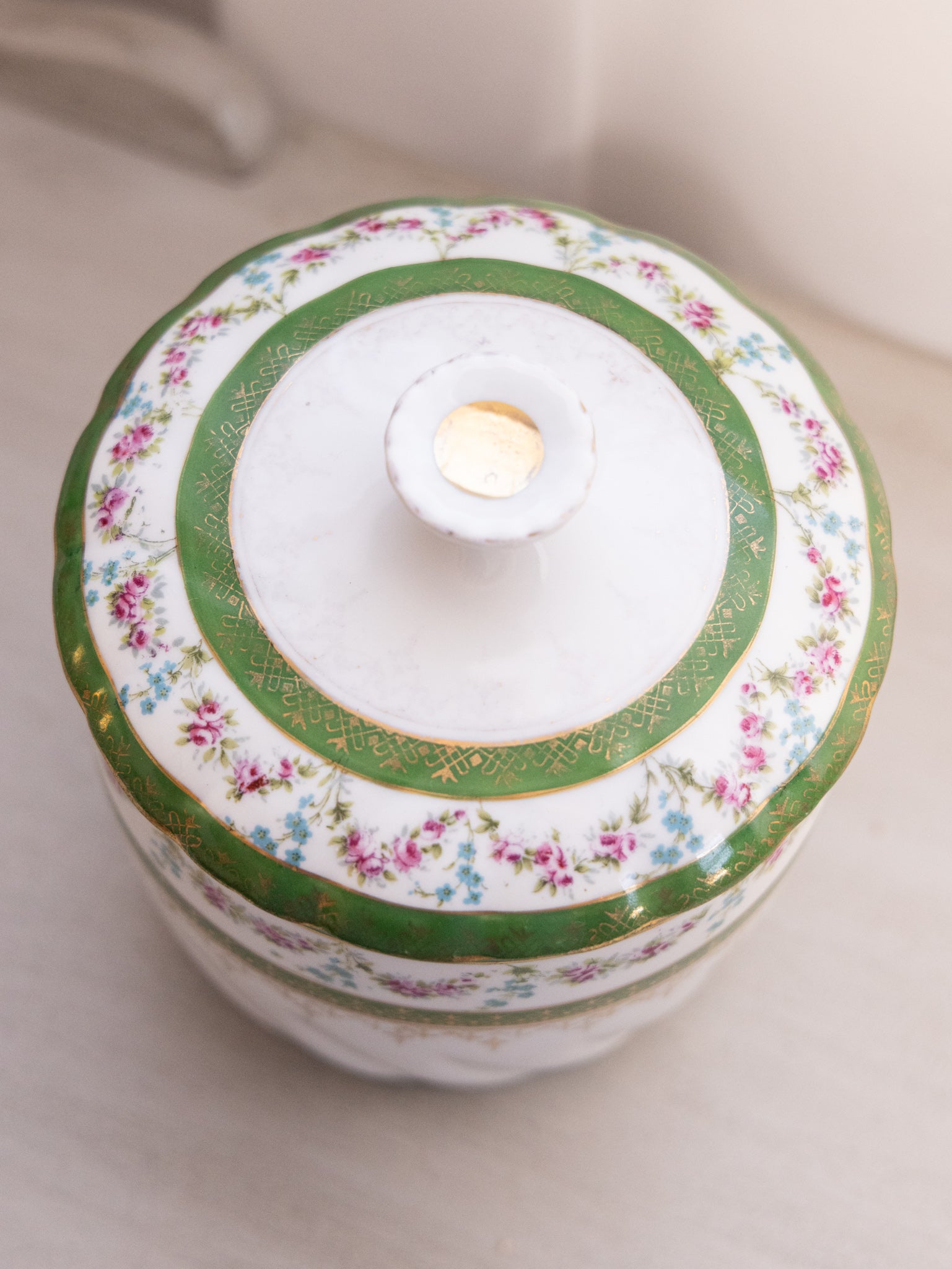 - Great used condition: item(s) may have light scratches, small marks, tarnishing/patina (for metal items), minor unevenness/wobbles, minor roughness/flea bites, and mild wear typical of age and normal use; some wear on the color and details (with the most significant wear being on the gold details on the lid); small chip on the rim of the lid.