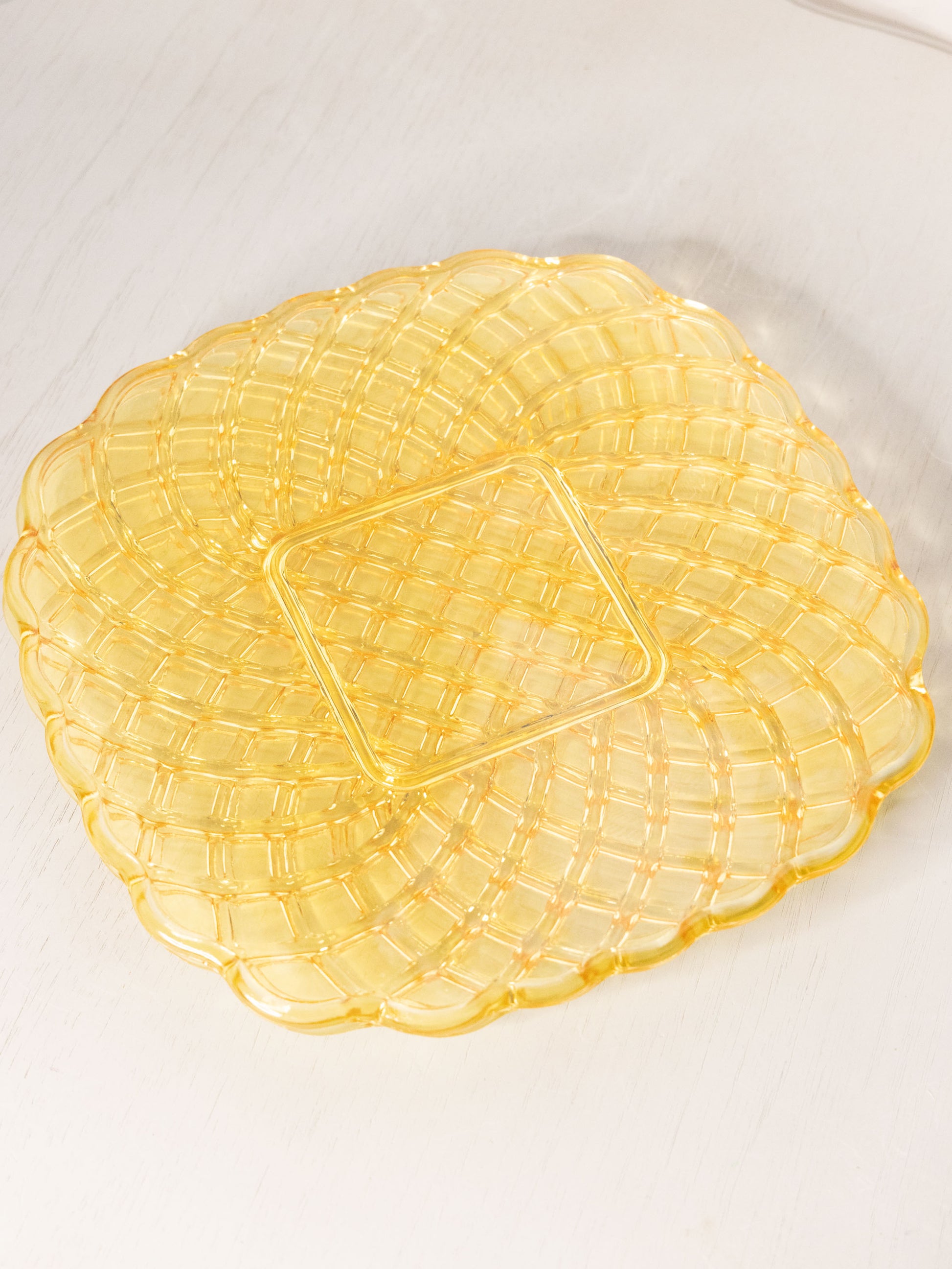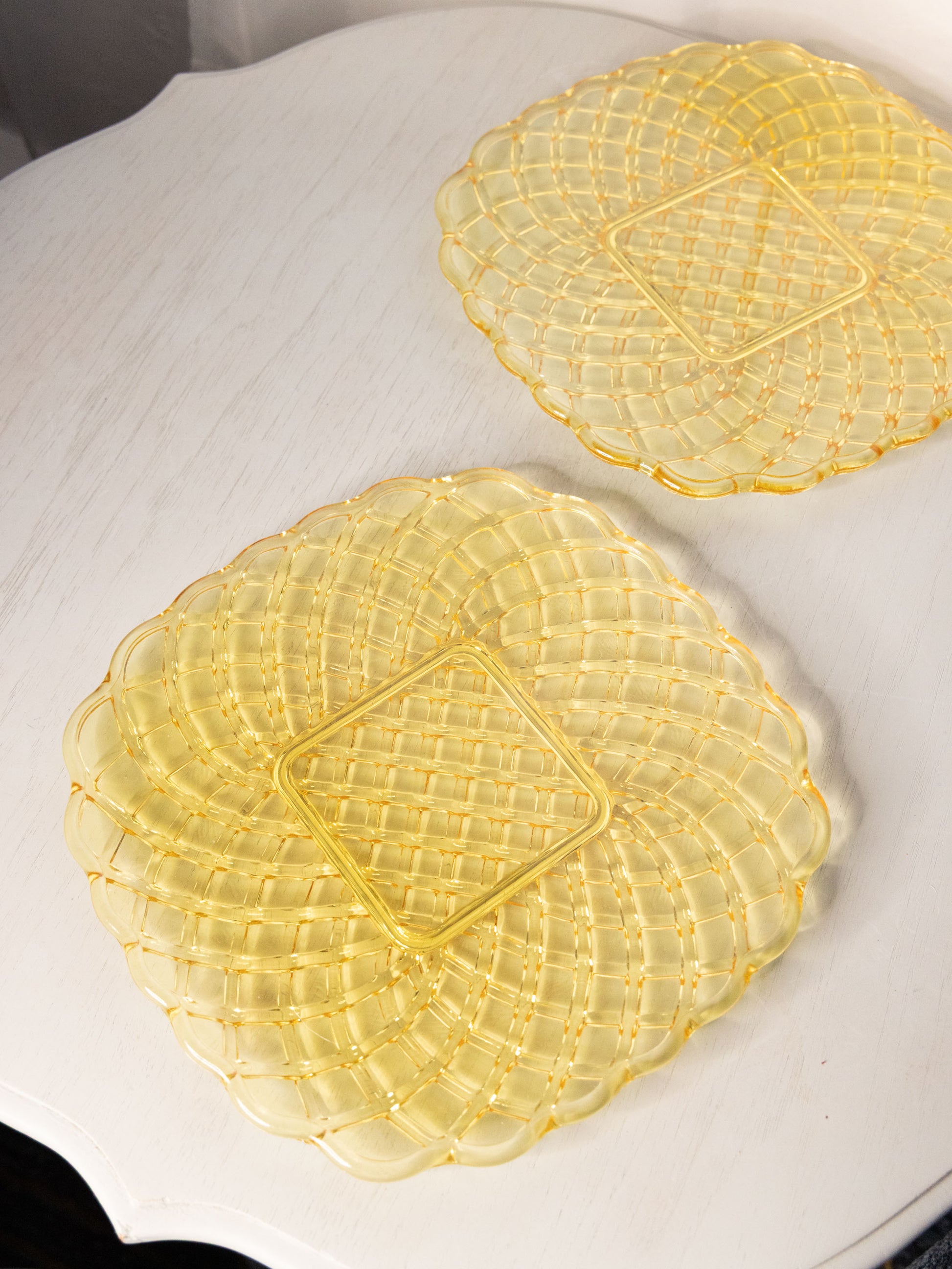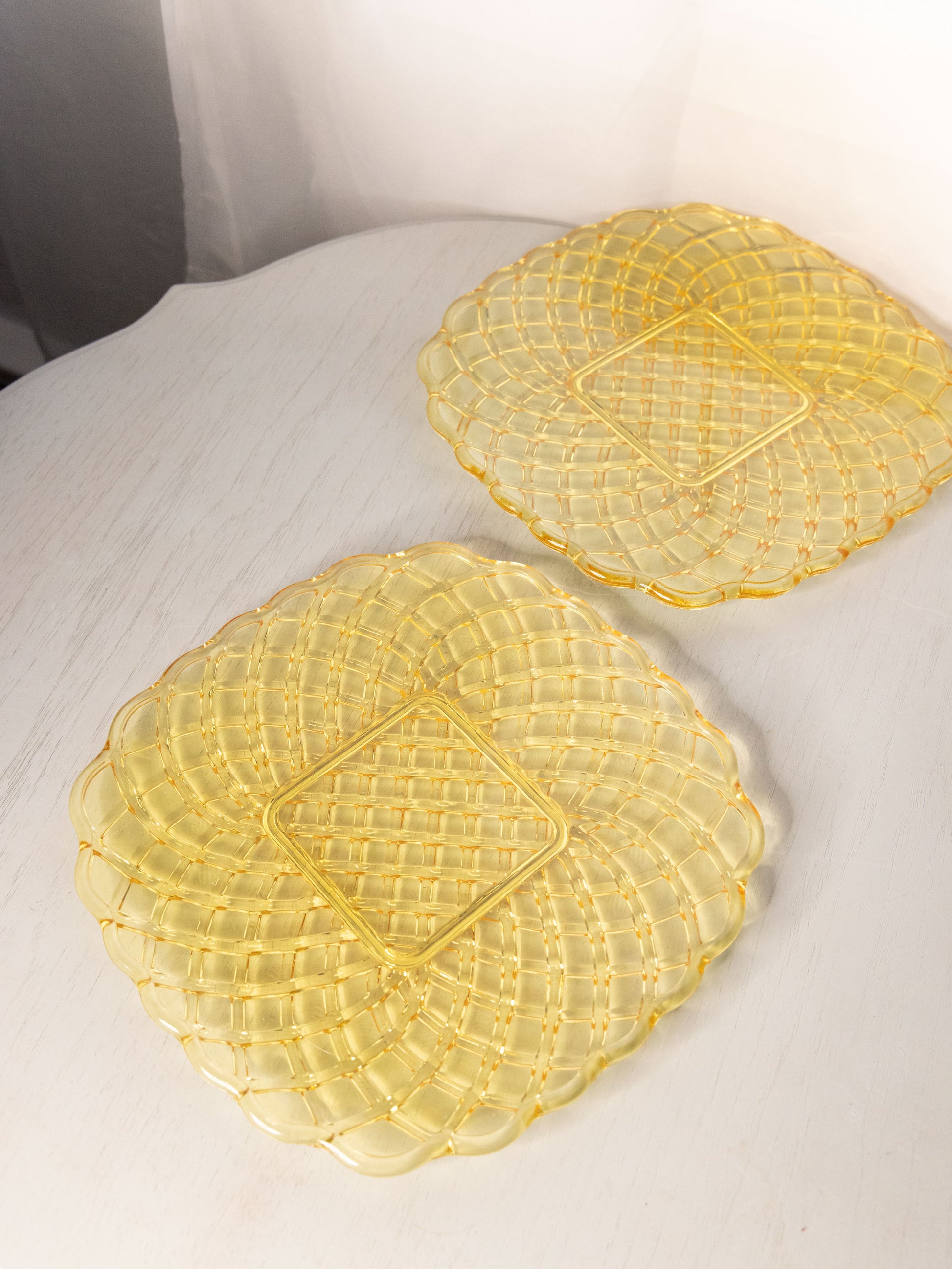 - Great used condition: item(s) may have light scratches, small marks, tarnishing/patina (for metal items), minor unevenness/wobbles, minor roughness/flea bites, and mild wear typical of age and normal use. Multiple sets available: one has a large chip/flaw possibly from production under one of the scallops.